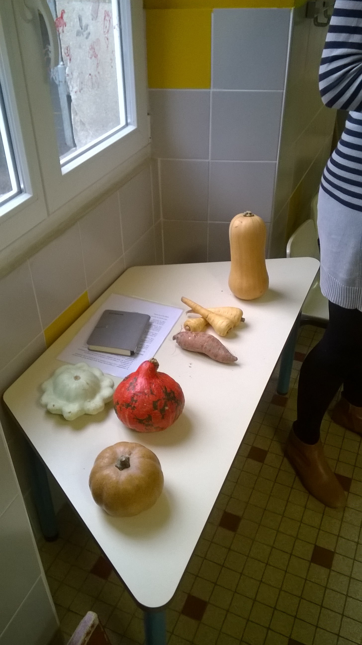 On a observé les légumes oubliés avec la maman de Baptiste : patate douce, panais, vitelotte, potimarron, butternut, topinambour, rutabaga, courge, pâtisson.
